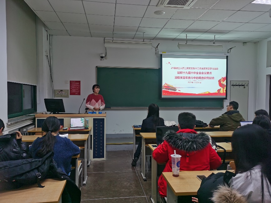 12月8日晚,太阳成集团tyc234cc2021级硕士人力资源管理二班党支部在公教二楼2217教室召开了以“回顾十九届六中全会会议要点,汲取党百年奋斗中的调查研究经验”为主题的党日活动。本次会议邀请支部理论指导老师刘松博作指导,并邀请了马克思主义学院博士宣讲团的讲师进行讲解,支部党员、积极分子参与了本次学习,其他支部骨干前来交流调研。