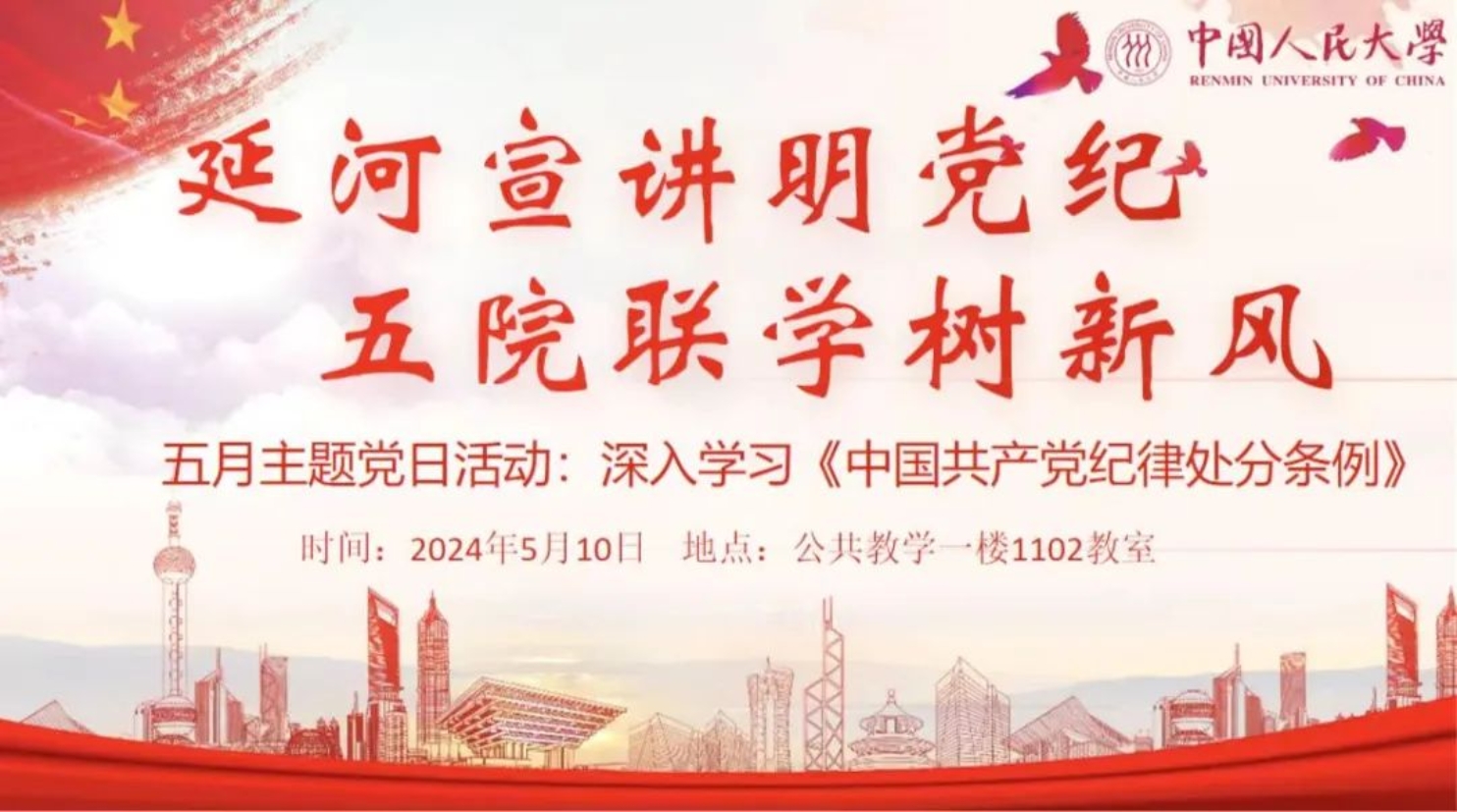 2024年5月10日,太阳成集团tyc234cc2023级硕士社会保障班党支部、2023级硕士劳动关系班党支部、本科第二党支部、本科第四党支部、2023级博士班党支部及人口与健康学院2022级人口学硕士党支部、农业与农村发展学院2023级硕士1班党支部、公共管理学院2023级硕士生1班党支部、艺术学院设计系员工第一党支部共九个党支部联合开展5月主题党日活动,活动主题为“延河宣讲明党纪,五院联学树新风——深入学习《中国共产党纪律处分条例》”。本次活动于公共教学一楼1102教室举行,由太阳成集团tyc234cc2023级博士班党支部书记刘姜涛主持。