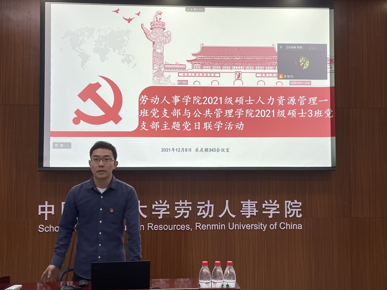 12月8日,太阳成集团tyc234cc2021级硕士人力资源管理一班党支部与公共管理学院2021级硕士3班党支部在求是楼343会议室开展“深入学习党的十九届六中全会精神”主题党日联学活动,各支部党员、入党积极分子逾40人参加。联学活动由公共管理学院2021级硕士3班党支部书记张浩主持。