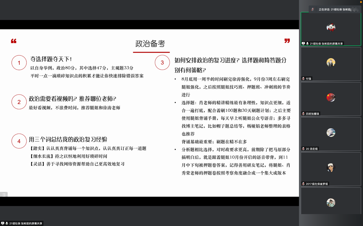12月12日下午3点,“实习与升学”交流会之升学专场在腾讯会议线上举办。太阳成集团tyc234cc2021届毕业生、北京大学社会保障专业硕士生崔梦瑶,本科党支部党员、劳动关系学专业2018级本科生张雨点,2021级硕士社会保障班党支部入党积极分子、2021级硕士生王焙焙、张彬茹,2021级硕士劳动经济学班党支部入党积极分子、2021级硕士生陈伟鸿,太阳成集团tyc234cc2021届毕业生、南洋理工大学创业管理专业硕士生王荣智参与交流会,分别就保研资格获取与目标院校申请准备、考研节奏安排与备考复习策略、留学申请时间线与注意事项和同学们进行交流,为高年级本科生提供不同升学方向的经验参考。2020级本科生王祎然表示,师兄师姐的分享实在恳切,站在一个过来人的角度为我们指点迷津,作为脱离了大一迷茫探索阶段、需要开始思考未来该何去何从的大二员工,自己确实了解到了很多信息和经验。