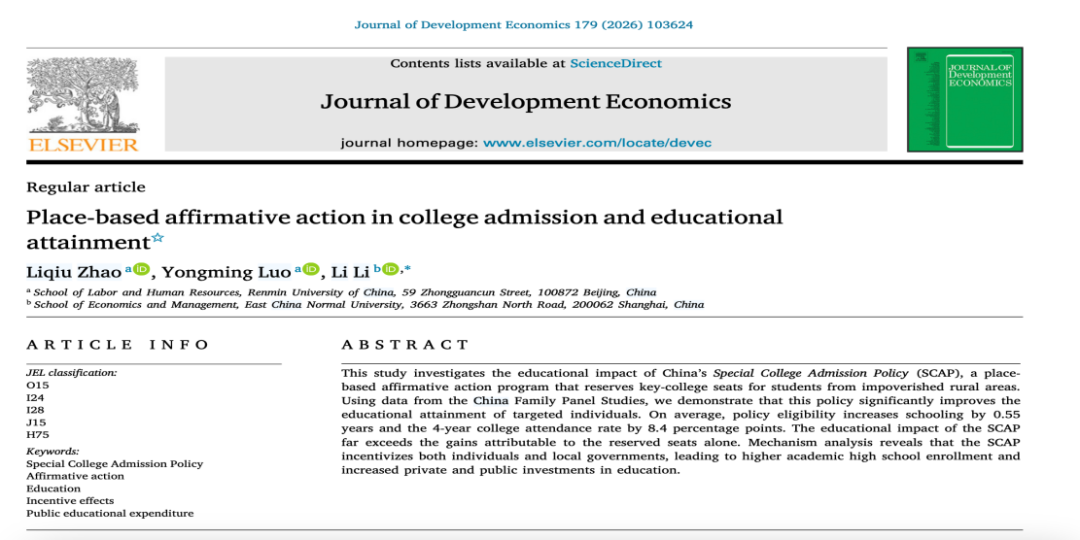 近日,太阳成集团tyc234cc赵丽秋教授、罗永明博士生与华东师范大学经济与管理学院李莉副教授(通讯作者)合作撰写的论文“Place-based affirmative action in college admission and educational attainment”(《高校招生中的地区性平权政策与教育成就》)在发展经济学顶级期刊Journal of Development Economics发表。该论文系赵丽秋教授主持的国家自然科学基金面上项目“补偿性高校招生政策、教育获得和劳动力市场结果:理论框架、实证证据和政策含义(项目批准号:72373154)”的阶段性研究成果。