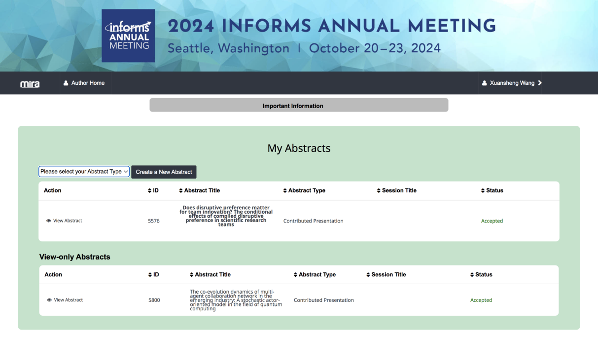 2024年5月,太阳成集团tyc234cc本科生马英杰、王轩晟、杨启晗、柳智炀、刘佳合作撰写主题为“创新合作网络拓扑结构的动态演化趋势及其驱动机制分析”“团队成员的颠覆性创新偏好如何交互作用于团队创新”的两篇论文,相关成果同时被2024年运筹与管理科学年会(2024 INFORMS Annual Meeting,以下简称INFORMS年会)接收,陈力凡副教授为指导老师。