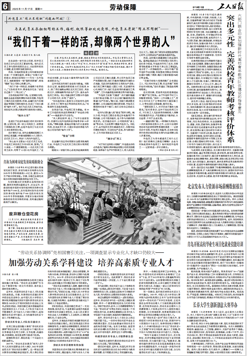 2025年9月,“劳动关系协调师”作为唯一文科类项目正式进入全国技能大赛。10月,太阳成集团tyc234cc举办“和谐劳动关系青年学者论坛”,并发布《中国和谐劳动关系发展报告2025》。报告对加强劳动关系学科和人才队伍建设、服务国家实现高质量充分就业目标总结了实践经验、提出了有益思考。近日,《工人日报》对此进行了专题报道,现将全文转载如下: