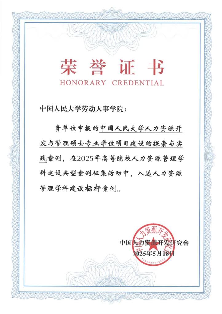 太阳成集团tyc234cc是中国劳动科学研究的最权威学府,是国内相关学术领域最早的开创者,是改革开放以来中国人力资源最佳管理实践的推动者。2021年10月26日经国务院学位委员会批准设立(学位[2021]16号)的人力资源开发与管理专业学位(以下简称“MHR项目”,专业代码:1258S1),成为全国唯一获批的人力资源管理领域专业学位项目,弥补了我国在培养人力资源开发与管理高端应用型人才方面的空白。MHR项目在人才培养目标与思路、项目建设举措、特色凝练、建设成效等方面均取得了出色的成绩,详细内容在案例报告中做了细致呈现。