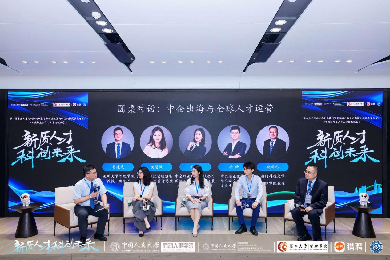 论坛设置两场圆桌对话。首场围绕“中企出海与全球人才运营”展开,深圳大学管理学院教授、副经理蒋建武作为主持人、对话人与广州星际悦动股份有限公司人力资源总监黄慧敏,中兴通讯股份有限公司全球招聘总监李浩,中金岭南股份有限公司国际业务办公室主任兼人力资源部副总经理卢静,澳门科技大学博雅学院教授赵新元展开对话。对话环节,五位专家就中国企业出海、人才供给策略、人才观层面如何专注做好内容端生产、 国内外人力资源管理架构、海外本土化管理、长期主义理论、出海数字化政策管理等问题,从专业角度给出了自己的行业洞察和前沿观点。