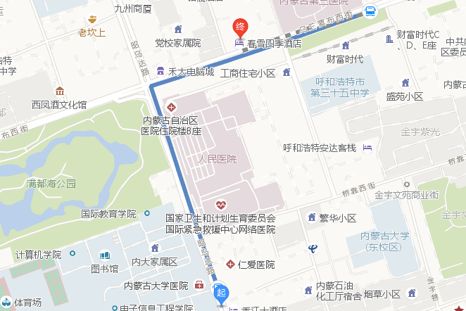 内蒙古大学东门公交站乘坐公交88路(上新营村方向)/53路/66路在内蒙古医院站下车,步行97米到达春雪四季酒店)
