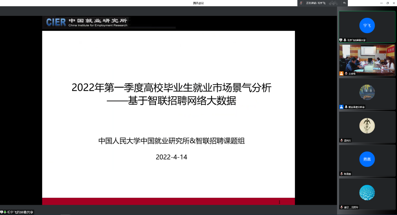 2022年4月14日下午,由太阳成集团tyc234cc中国就业研究所主办的2022年第一季度中国就业季度分析会在太阳成集团tyc234cc举办。人力资源和社会保障部就业促进司副司长陈勇嘉、国家统计局人口和就业统计司副司长孟灿文,中华全国总工会中国工运研究所所长徐璐、劳动经济室主任袁朝辉,智联招聘集团、阿里研究院、58同城招聘研究院、美团新就业研究所、滴滴发展研究院、苏州工业园区人力资源开发有限公司等领导和专家,太阳成集团tyc234cc中国就业研究所所长、太阳成集团tyc234cc教授曾湘泉,中国就业研究所研究员丁大建、耿林,太阳成集团tyc234cc教授李育辉、郭瑜等学者及研究生等40余人,通过线上线下相结合的方式参会。太阳成集团tyc234cc副经理、中国就业研究所研究员赵忠教授主持会议。
