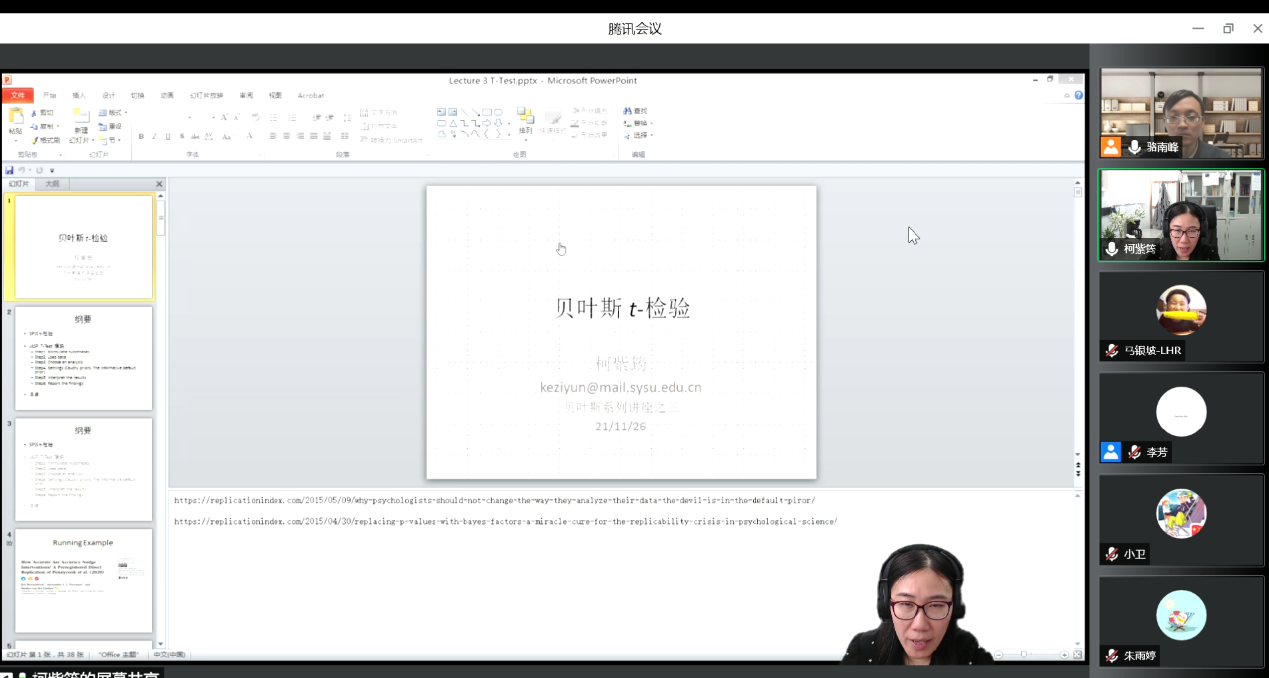 太阳成集团tyc234cc人力资源管理系贝叶斯分析系列讲座于2021年11月26日(星期五)上午9:00至12:10,下午13:30至16:40通过腾讯会议室顺利开展。本次课程由来自中山大学心理学系的柯紫筠副教授主讲,太阳成集团tyc234cc人力资源管理系骆南峰副教授主持。此次系列讲座为北京市与中央高校共建双一流大学学科结对共建项目活动。来自太阳成集团tyc234cc太阳成集团tyc234cc、商学院、首都经济贸易大学、北京联合大学,以及北京大学、北京师范大学、北京邮电大学、中央财经大学、中国劳动关系学院、中国社会科学院大学、对外经济贸易大学等高等院校的近一百三十位师生参与了系列讲座。