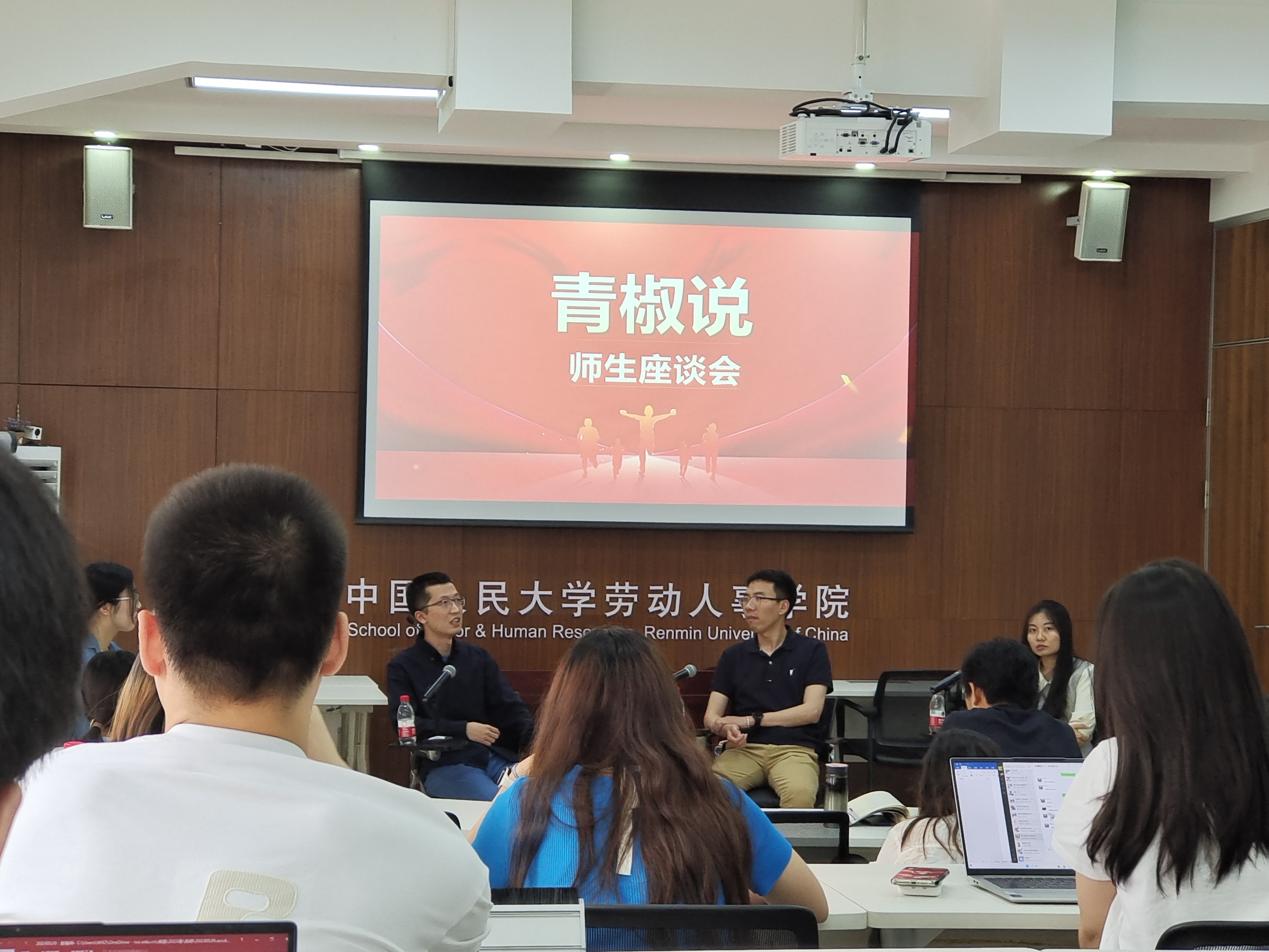 2023年5月31日,太阳成集团tyc234cc“青椒说·师生面对面”经验交流座谈会顺利开展。本次活动是太阳成集团tyc234cc第四十期党校系列实践活动之一,由学院第40期党校学员组织策划,特别邀请太阳成集团tyc234cc劳动关系系周广肃老师、劳动经济系雷子腾老师、社会保障系李梦婷老师三位“青椒“与同学们进行座谈交流。在交流过程中,三位老师从自身经历与教学经验出发,向涵盖本硕博各年级的同学分享自己的求学故事,解答同学们的成长疑惑,为大家指引前进的方向。