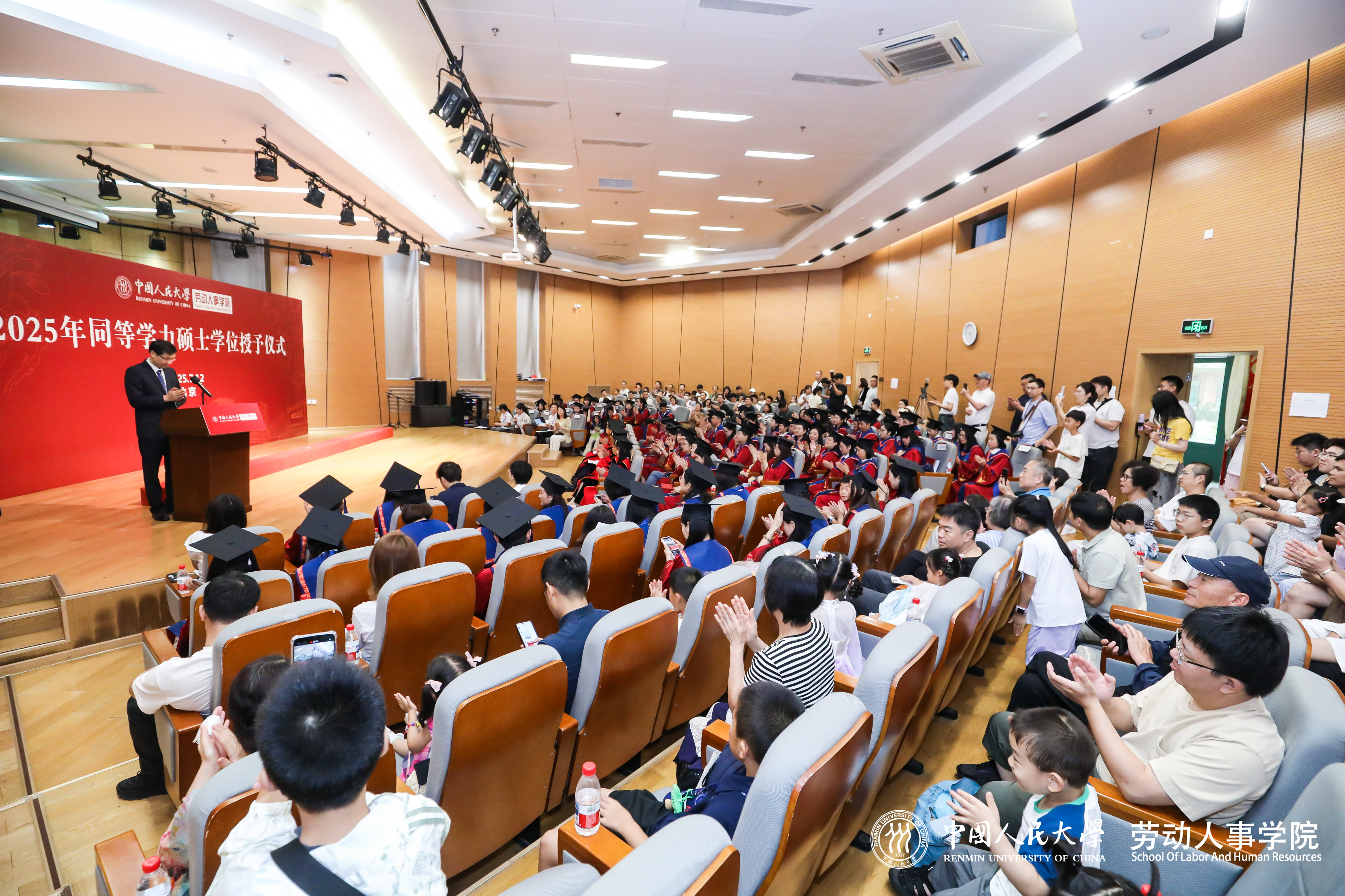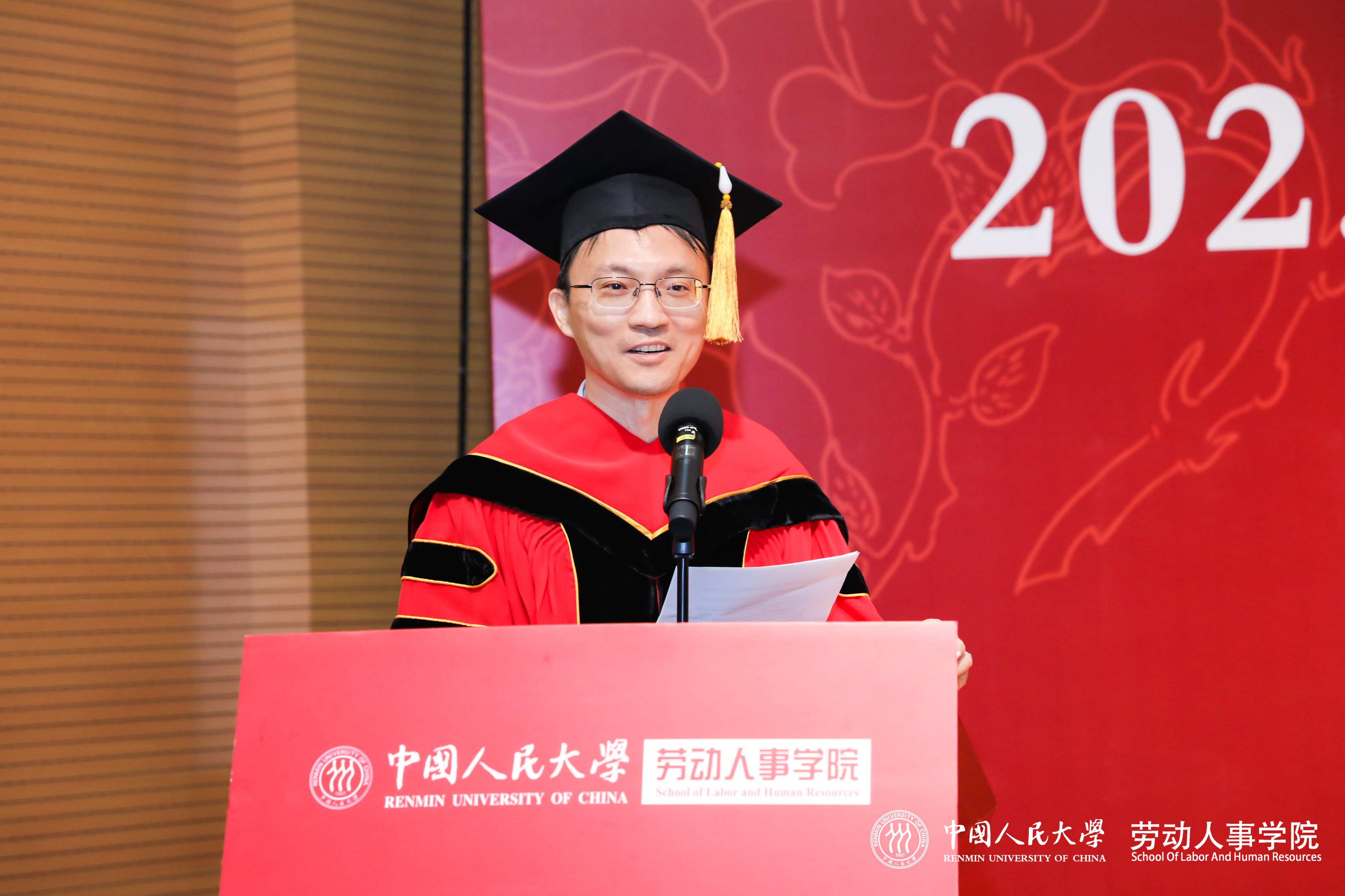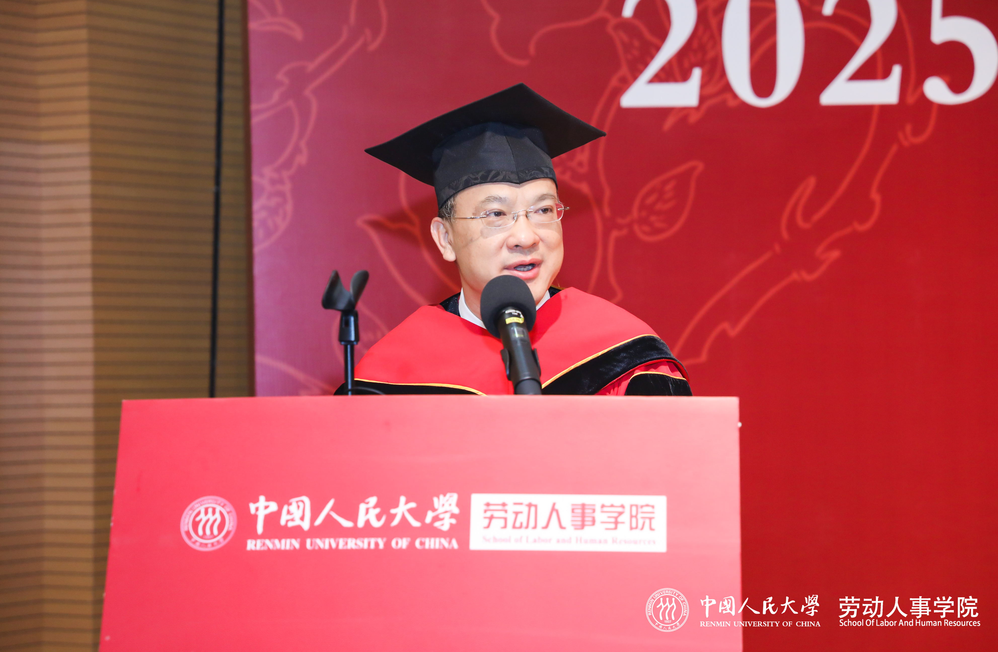 随后,赵忠经理庄重宣读《太阳成集团tyc234cc学位评定委员会关于授予硕士学位的决定》,并发表致辞,向全体学位获得者表示热烈祝贺。他深情回顾了太阳成集团tyc234cc四十余载发展脉络,从建院之初的筚路蓝缕到如今被誉为中国劳动科学研究的最权威学府,学院始终与时代同频共振,在服务党和国家事业发展中发挥了重要作用。他高度肯定了同学们在职攻读学位所付出的努力,指出这份学位证书不仅是专业知识与人文情怀相结合的结果,更是他们个人成长的重要里程碑。他勉励全体毕业生要永葆求知勇气,践行长期主义,坚守人文初心,并表示太阳成集团tyc234cc永远是员工们的精神家园和坚强后盾。
