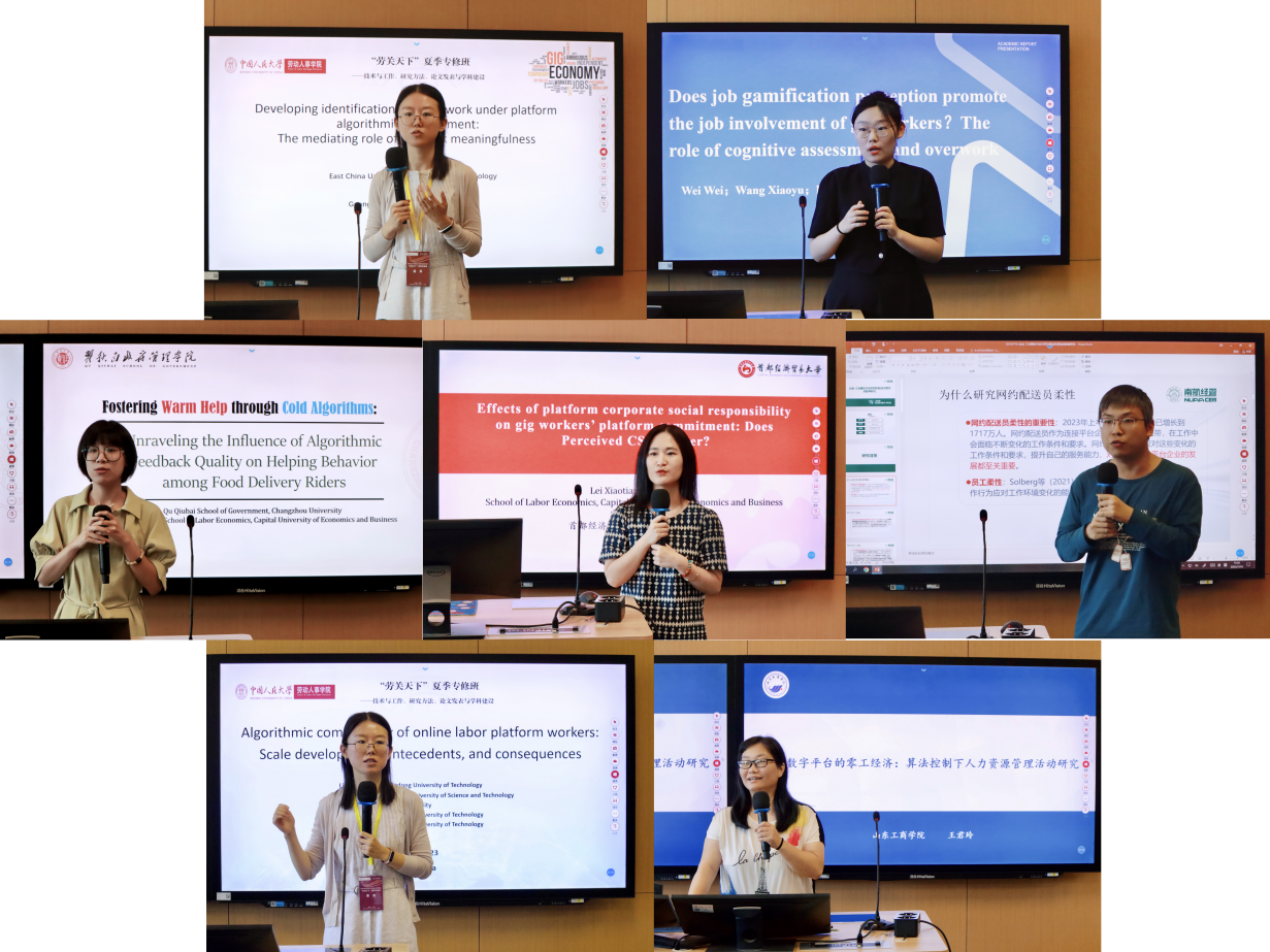 来自南京航空航天大学、华南理工大学、首都经济贸易大学、北京物资学院、常州大学、山东工商学院的6名专家学者进行了7组报告,与会师生围绕平台算法管理下的零工身份认同构建机制、算法控制下零工工作者工作卷入的作用机制、平台劳动者的组织依附性、平台应用算法推荐技术带来的伦理风险等具有现实性和实践意义的议题展开分享与讨论。