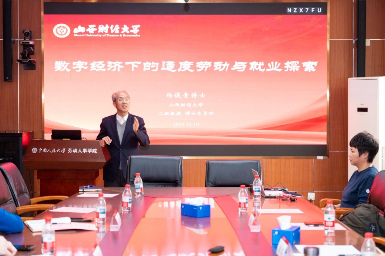 山西财经大学山西省中小企业发展研究院经理杨俊青教授谈到中国就业的过去与未来将是从工业经济到数字经济、从劳动力无限供给到劳动力有限与稀缺、从数量到质量、从工资保障到工资激励的转变;接着分享了他对数字经济下的适度劳动与就业的探索,他指出,数字经济带来劳动时空动态化、工作生活边界模糊化、岗位任务化等新特征。在此背景下,应推动管理方式向“数字人本管理”转型,构建适应“人机协作”的人力资源管理体系,以实现更可持续的就业发展。他并深情回顾了跟随曾湘泉教授参与学术活动的经历。