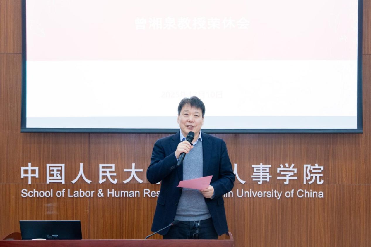赵忠经理代表学院致辞。他回顾了曾湘泉教授在学科发展、学院建设、教书育人和学术研究等多方面的贡献。赵忠表示,曾湘泉教授的学术品格与领导智慧深深影响了学院发展与学院文化,期待他未来继续关心和支持学院与劳动科学事业。