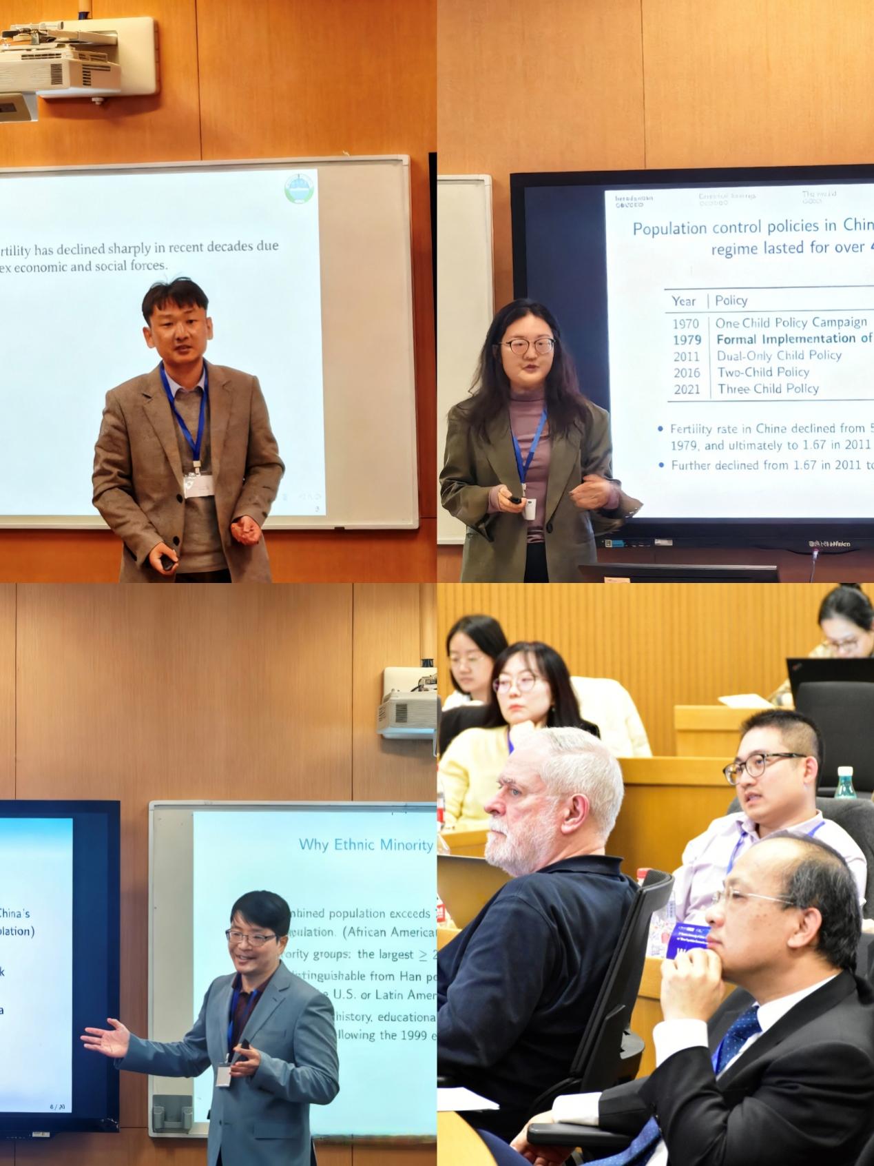 第一场学术报告由来自辽宁大学的陈烽助理教授主持。首先,伦敦大学皇家霍洛威学院的钱鹏展博士分享了题为“Unintended Demographic Effects of Educational Affirmative Action in China(中国教育平权行动的意外人口影响)”的研究。接着,北京大学博士后连莉莉报告了题为“Amplified Population Control Policies through Social Norms: Evidence from China’s One-Child Policy(通过社会规范强化人口控制政策:来自中国独生子女政策的证据)”的研究。最后,来自辽宁大学的陈烽助理教授分享了题为“Input-Trade Liberalization, Female-Skill Intensity and Fertility in China(中国投入品贸易自由化、女性技能强度和生育率)”的文章。