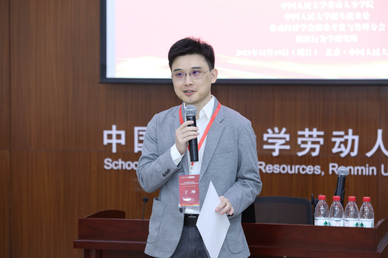 随后,三位优秀论文获奖者代表作论文报告。第一位是首都经济贸易大学劳动经济学院人才学系教授苗仁涛,报告题目为“工作不安全感是导致员工离职还是工作投入:内外部自我职业生涯管理双中介机制效应”。第二位是中国劳动关系学院劳动关系与人力资源学院讲师高雪原,报告题目为“基于扎根理论的零工工作压力感知形成机理:以外卖骑手为例”。第三位是北京大学员工心理健康教育与咨询中心副主任、副教授庄明科,报告题目为“高校职业生涯发展咨询工作室建设标准研究”。