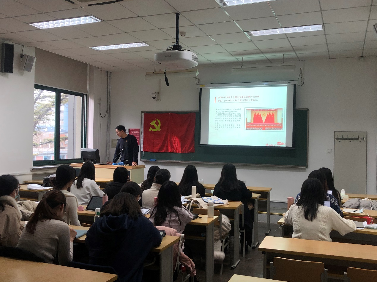 支部书记马迪首先带领大家共同回顾了近两个月学习十九届六中全会精神的情况。马迪表示,从前期观看新闻发布会到主题党日活动上集体学习十九届六中全会公报,支部成员始终在不断进步、不断思考。今天邀请到马克思主义学院博士宣讲团讲师张志强为大家进行《中共中央关于党的百年奋斗重大成就和历史经验的决议》的讲解,希望支部成员能够有进一步的收获。