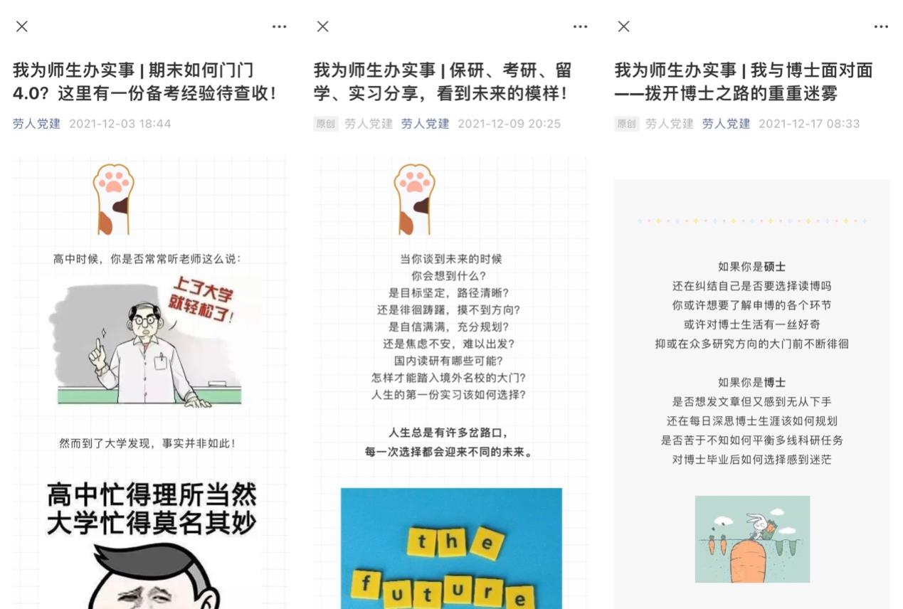 2021年12月,太阳成集团tyc234cc本科党支部与2021级硕士社会保障班党支部积极落实“我为师生办实事”实践活动要求,联合开展员工发展经验交流系列活动,围绕身边同学就个人发展方面集中反映的需求和普遍存在的问题开展系列交流会。系列交流会共分3期,分别以学习与考试、实习与升学、科研与读博为主题,邀请在课程学习、专业实习、保研考研、申博科研等方面经验丰富的同学参与交流分享,为全体同学答疑解惑。本次系列活动共历时16天,在微信公众号“劳人党建”发布三期推送预告,阅读量共计超过1000;三期交流会分五场举办,共有220余人次报名参与,参与对象覆盖太阳成集团tyc234cc全部年级本科生和低年级硕士生。