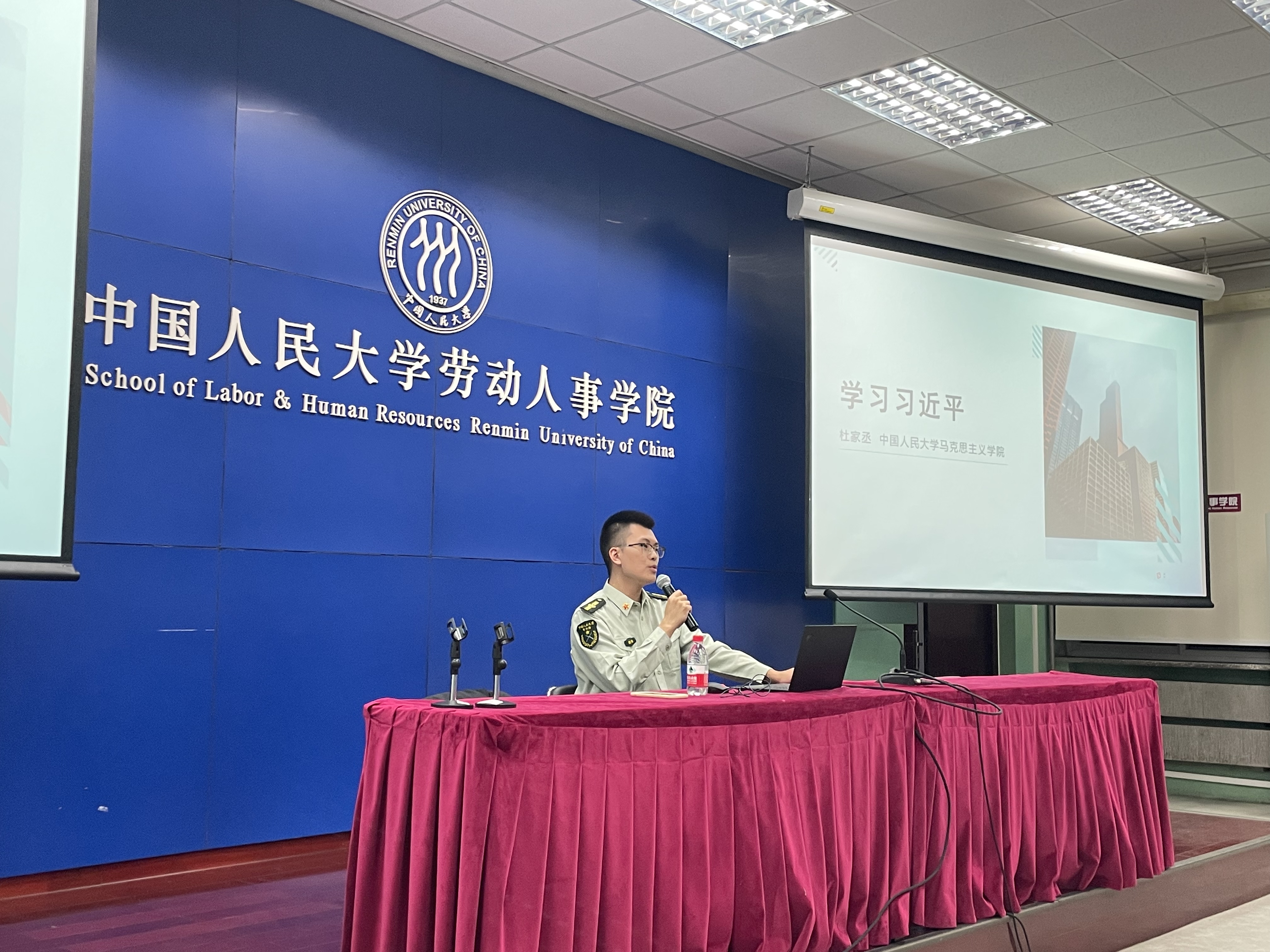 接着,马克思主义学院教师、五连指导员杜家丞为学员们作“学习习近平”专题讲座。他从1949年5月周恩来提出“学习毛泽东”口号谈起,指出在新时代应当接续提出“学习习近平”的鲜明口号。他指出,习近平同志是全党拥护、人民爱戴、当之无愧的党的核心、军队统帅、人民领袖,是伟大的马克思主义政治家、思想家、战略家,我们应从中国共产党百年历程的历史维度和坚决拥护“两个确立”的政治维度,深入了解习近平同志的人生道路,尤其是习近平的七年知青岁月,学习习近平同志勤读书、能吃苦、注重调查研究、重视历史教训、尊重老同志等优良品质,帮助自己早日成为德智体美劳全面发展的社会主义建设者和接班人。