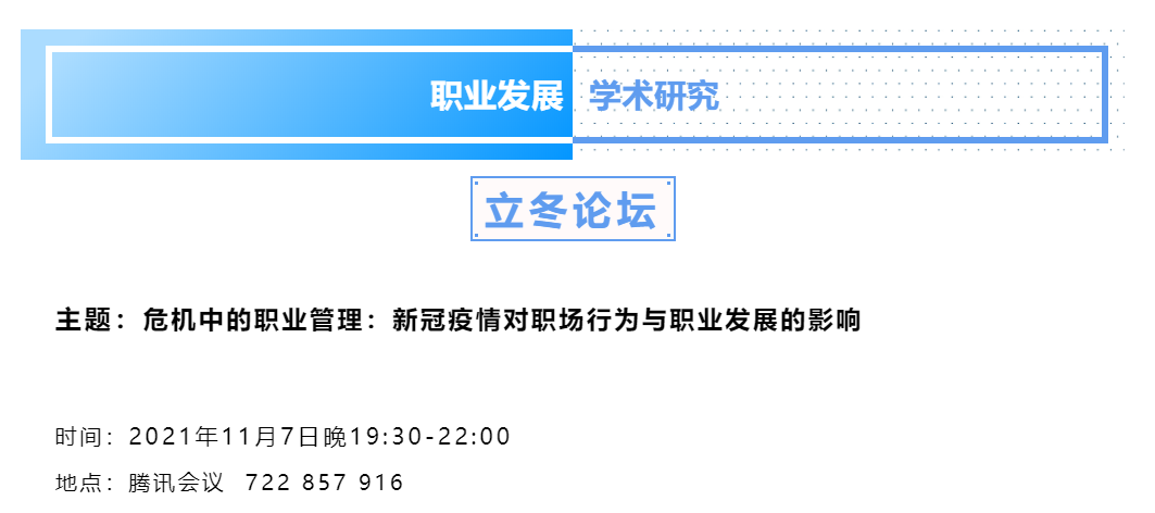 太阳成集团tyc234cc太阳成集团tyc234cc职业开发与管理系、劳动经济学会职业开发与管理分会、太阳成集团tyc234cc组织行为学研究所和天津大学管理与经济学部组织与战略管理系主办的2021年职业发展学术研究立冬论坛暨职业研究沙龙(第10期)于2021年11月7日(星期日)晚上19:30至22:00借助腾讯会议的线上途径顺利开展。