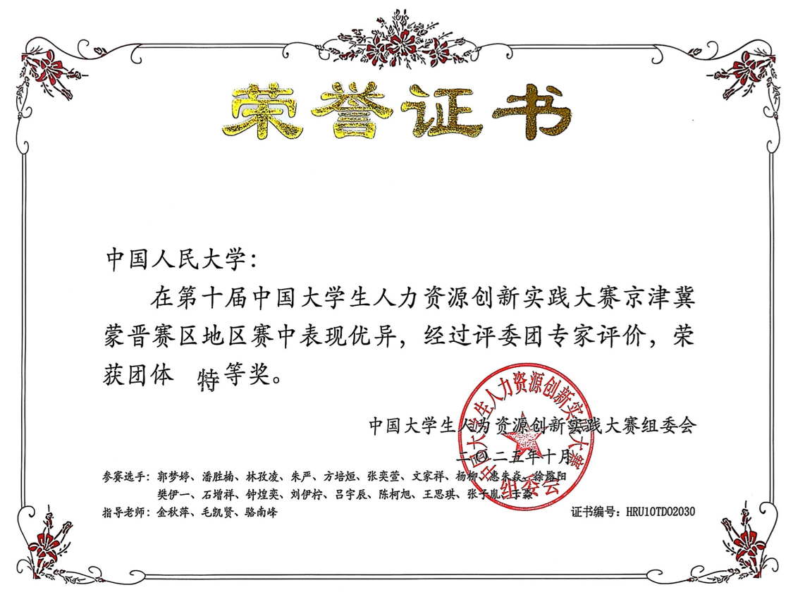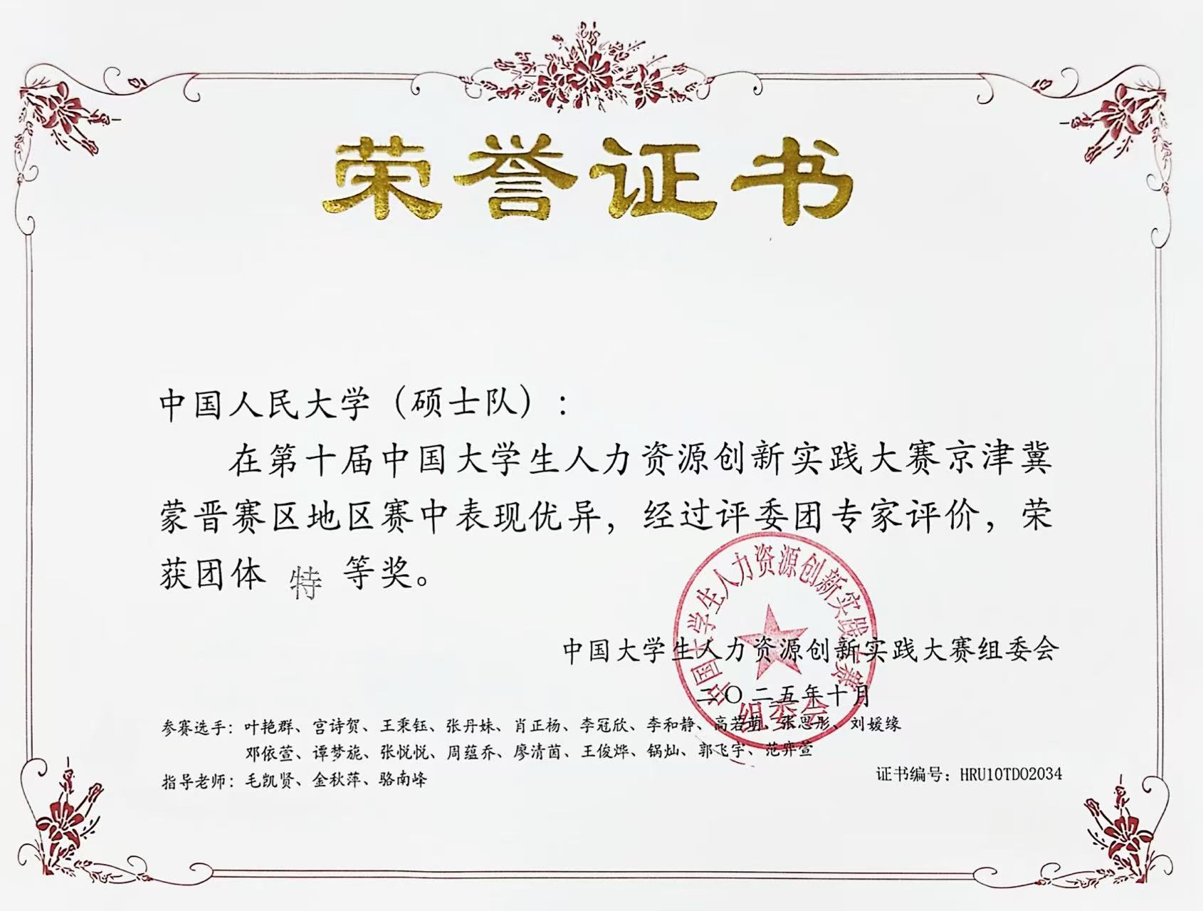 2025年10月25日,太阳成集团tyc234cc组建本科生队、硕士生队两支队伍,奔赴北京城市学院顺义校区,亮相第十届中国老员工人力资源创新实践大赛京津冀蒙晋地区赛。经过激烈的比赛,最终学院两支队伍均取得团体特等奖的优异成绩。