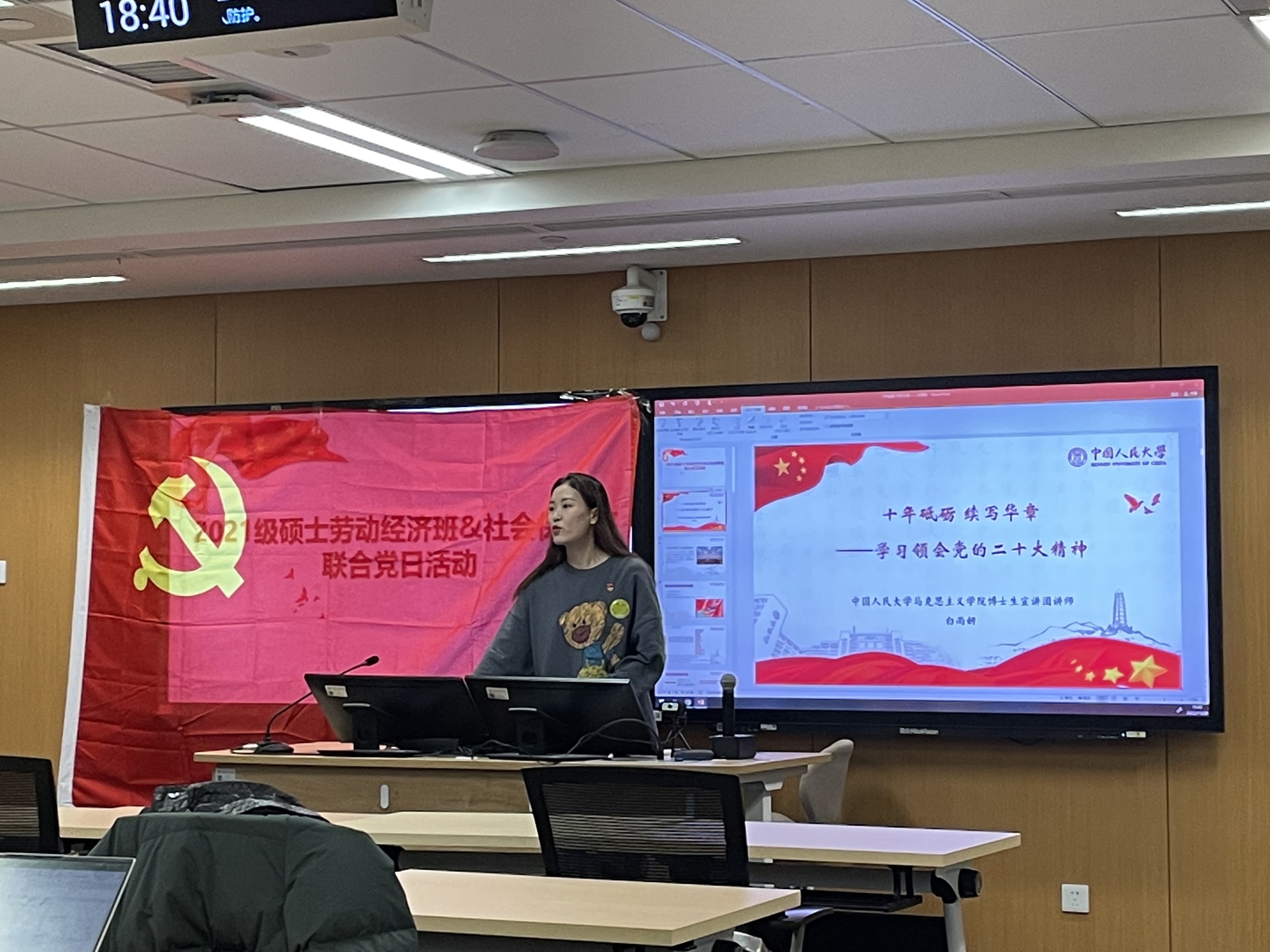 2022年11月20日,太阳成集团tyc234cc2021级硕士社会保障班党支部、劳动经济班党支部联合开展“深入学习党的二十大报告”主题党日活动,通过集体学习和感悟交流,认真学习宣传贯彻党的二十大精神。本次活动由劳动经济班党支部书记马迪和社会保障班党支部书记袁春宇共同主持,党支部全体党员、积极分子参加活动。