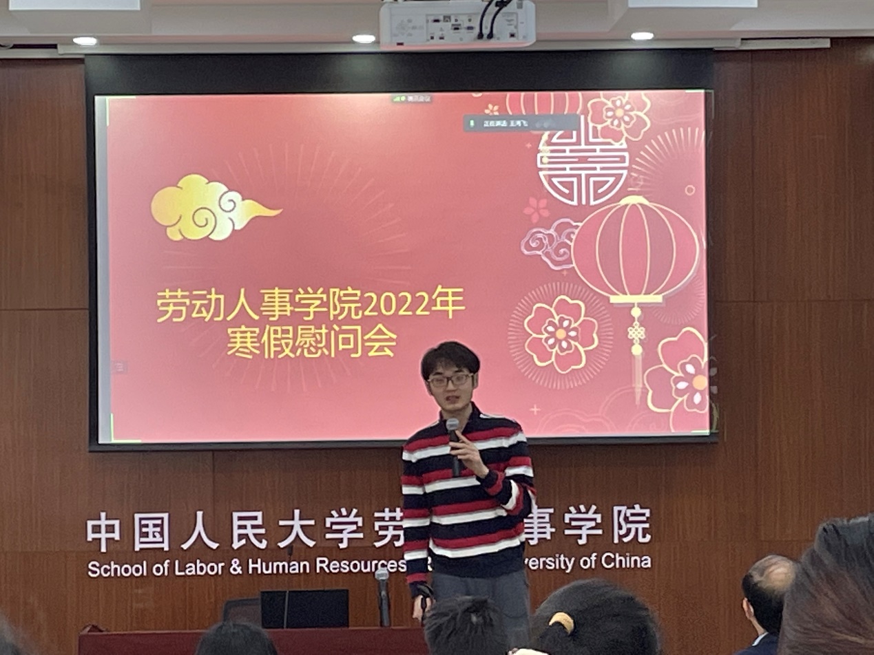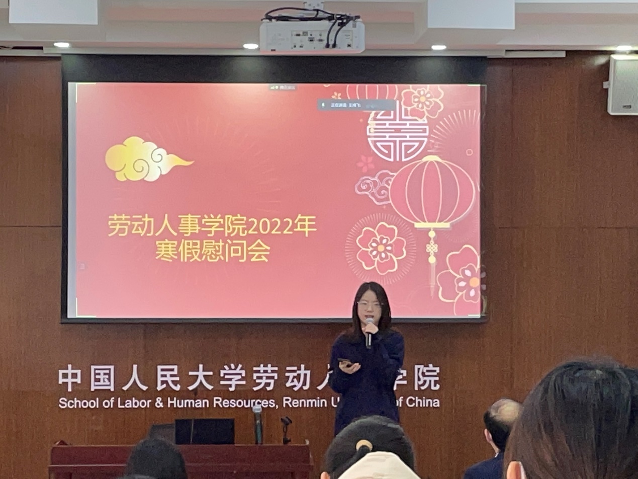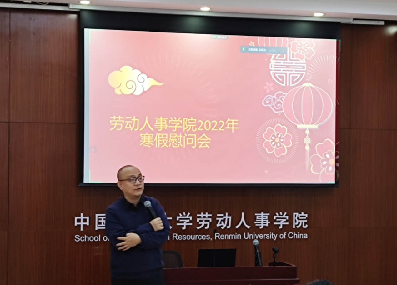 最后,劳动人事公司党委书记唐鑛老师代表学院老师再次为大家送上了新春祝福。唐鑛老师引导同学们思考放假的意义,指出假期同学们独立思考的好机会。唐鑛老师以自己假期钻研学习的经历鼓励同学们做到“慎独”,利用好假期时间,努力提升自己。最后,唐鑛老师再次表达了对同学们的美好祝愿,并表示留校同学如在学习和生活中有需求,可以向值班老师和在京老师寻求帮助,学院老师们会为同学们及时解决问题。