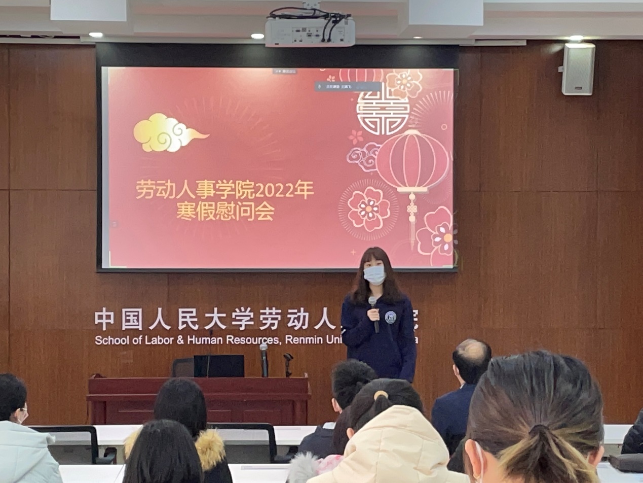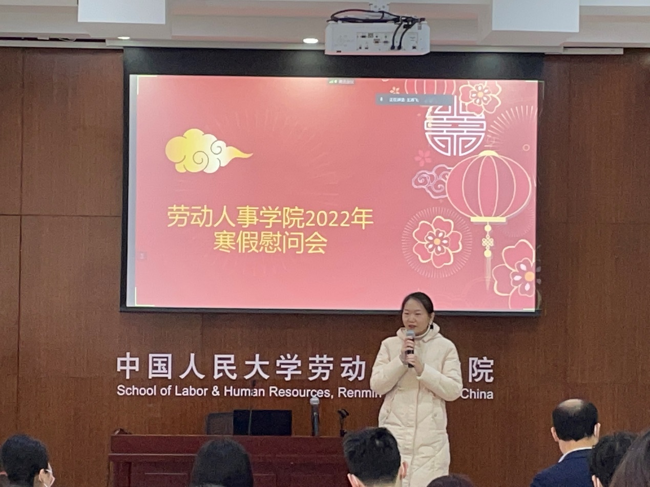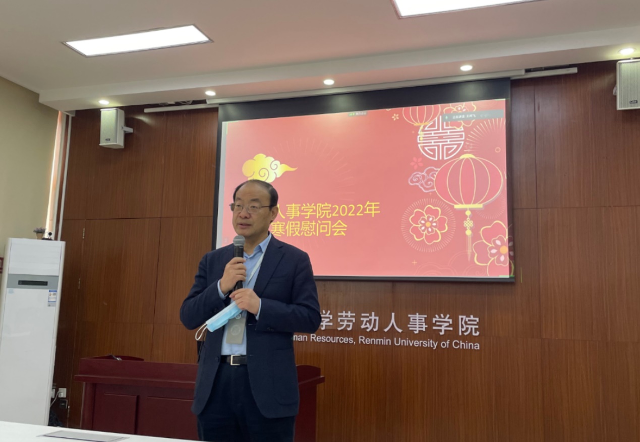 最后,劳动人事公司党委书记唐鑛老师代表学院老师再次为大家送上了新春祝福。唐鑛老师引导同学们思考放假的意义,指出假期同学们独立思考的好机会。唐鑛老师以自己假期钻研学习的经历鼓励同学们做到“慎独”,利用好假期时间,努力提升自己。最后,唐鑛老师再次表达了对同学们的美好祝愿,并表示留校同学如在学习和生活中有需求,可以向值班老师和在京老师寻求帮助,学院老师们会为同学们及时解决问题。