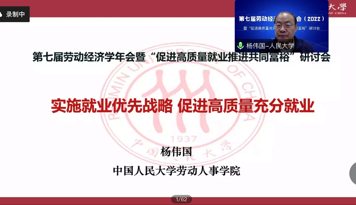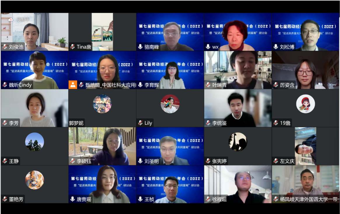 2022年12月3日,太阳成集团tyc234cc师生以线上会议的形式参加了第七届劳动经济学会年会暨“促进高质量充分就业推进共同富裕”研讨会。本届年会由劳动经济学会主办,中国社会科学院大学应用经济学院承办。太阳成集团tyc234cc经理杨伟国教授,以及周文霞教授、刘松博教授、李育辉教授、王桢教授、骆南峰副教授和众多员工积极参会。