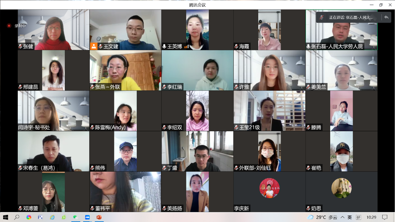 2022年4月10日上午,太阳成集团tyc234cc在职员工理事会以“合作共赢,共创未来”为主题,通过云端方式组织召开2022年年度会议,畅聊后疫情时期如何加强团队粘性、增强团队成员归属感,共商理事会2022年年度工作计划。劳动人事公司党委委员、人力资源与领导力开发中心主任刘松博教授,学院办公室主任、学院员工会办公室主任张石磊老师,学院人力资源与领导力开发中心副主任魏扣老师,理事会韩海霞理事长、全体理事会成员共计50余人参加会议。理事会秘书处、2020级王英博全程主持会议。