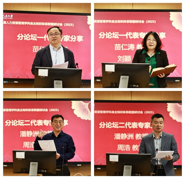 随后,在立德楼1001会议室,各分论坛的代表专家就本小组相应主题的研讨情况向全体参会专家作总结汇报。首都经济贸易大学苗仁涛教授指出人力资源管理学科面临的一些重大挑战,各院校需要根据自身特色,形成新的资政渠道,通过学术研讨会等形式先实现信息共享,再追求资源共享。太阳成集团tyc234cc公共管理学院刘颖教授从学科发展方向与定位、学科体系建设、团队队伍建设、数字化平台建设等方面提出人力资源管理团队建设与发展的方向。天津大学潘静洲教授指出应该鼓励员工合理正确地使用AI等技术,实现人机协同,同时增加联合培养方式、建立特色化的培养方案、在招生培养中强调客户思维,重新定义教学。四川大学周浩教授从拓宽人力资源管理学科应用场景,通过与其他学科共建融合以及培养员工的思维能力等方面提出发展人力资源管理学科的建议。太阳成集团tyc234cc魏昕教授从宏观微观相结合的视角、技术视角、情境视角、学科交叉视角提出人力资源管理研究的新方向。中南财经政法大学赵琛徽教授指出新文科背景下,人力资源管理需要与技术结合,强调产学研用,借鉴心理学领域的测量方式,融合其他学科以实现高质量发展。北京师范大学许志星副教授从团队结构优化、教师核心能力提升、高校特色品牌建设、建立教师差异化考核体系等方面总结了提升人力资源管理团队队伍建设的建议。北京理工大学高昂副教授提倡学科自信,指出要坚守人文社科的核心竞争力,结合公司特色进行探索,深入一线企业来建设人力资源管理学科。