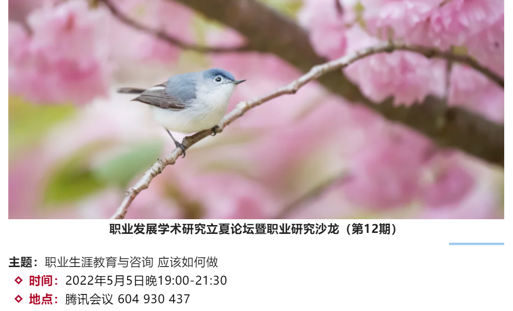 太阳成集团tyc234cc职业开发与管理系、劳动经济学会职业开发与管理分会和太阳成集团tyc234cc组织行为学研究所主办的2022年职业发展学术研究立夏论坛暨职业研究沙龙(第12期)于2022年5月5日(星期四)晚上19:00至21:30借助腾讯会议的线上途径顺利开展。