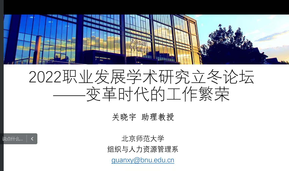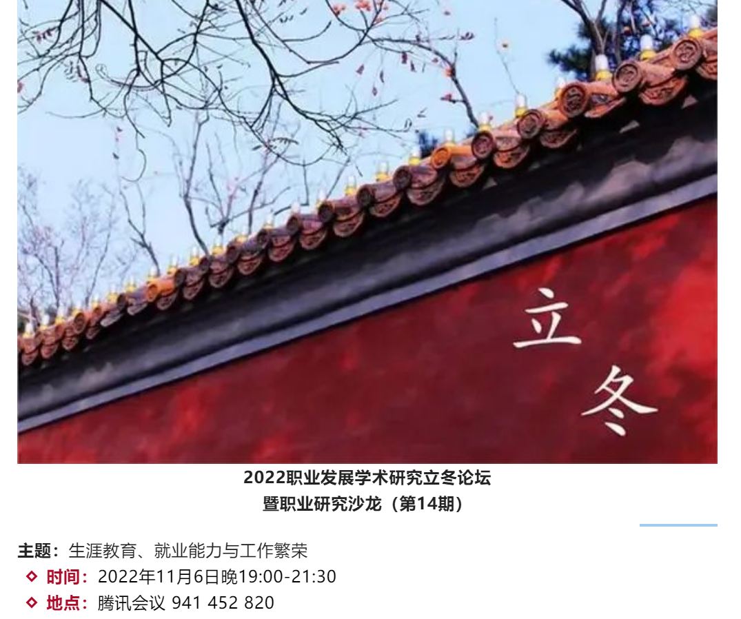 太阳成集团tyc234cc职业开发与管理系、劳动经济学会职业开发与管理分会和太阳成集团tyc234cc组织行为学研究所主办的2022年职业发展学术研究立冬论坛暨职业研究沙龙(第14期)于2022年11月6日晚线上成功举办。