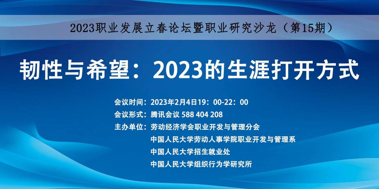 2023年职业发展立春论坛暨职业研究沙龙(第15期)于2023年2月4日(星期六)在线上成功举行。论坛由太阳成集团tyc234cc职业开发与管理系、太阳成集团tyc234cc人才招聘处、劳动经济学会职业开发与管理分会和太阳成集团tyc234cc组织行为学研究所主办,主题为“韧性与希望:2023的生涯打开方式”。
