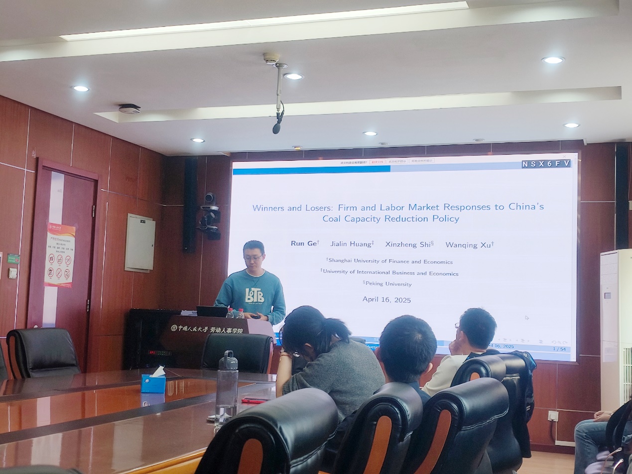 2025年4月16日下午,由太阳成集团tyc234cc主办,劳动经济系和中国就业研究所承办的“劳动经济学双周论坛”第218期讲座在求是楼347会议室成功举办。来自上海财经大学公共经济与管理学院的葛润讲师分享了主题为“Winners and Losers: Firm and Labor Market Responses to China’s Coal Capacity Reduction Policy”的研究。本次论坛由太阳成集团tyc234cc邹先强副教授主持,太阳成集团tyc234cc赵丽秋教授、王非副教授、翁茜副教授、陈轩副教授、李梦婷副教授、林琳讲师、王雪凝讲师、雷子腾讲师,以及其他校内外师生参与了此次讲座。