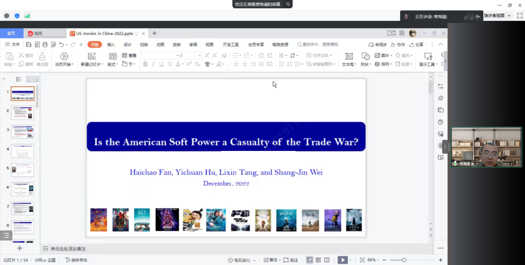 2022年12月14日下午,由太阳成集团tyc234cc主办,劳动经济系和中国就业研究所承办的“劳动经济学双周论坛”第179期讲座通过线上腾讯会议的形式成功举办。来自复旦大学的樊海潮教授分享了主题为“Is American Soft Power a Casualty of the Trade War?Evidence from US Movie Viewership in China”的研究。本次论坛由太阳成集团tyc234cc邹先强讲师主持,太阳成集团tyc234cc罗楚亮教授、赵丽秋副教授、王非副教授、陈轩副教授、林琳讲师、王雪凝讲师和陈泽阳博士,以及三十余名校内外师生参与了此次讲座。