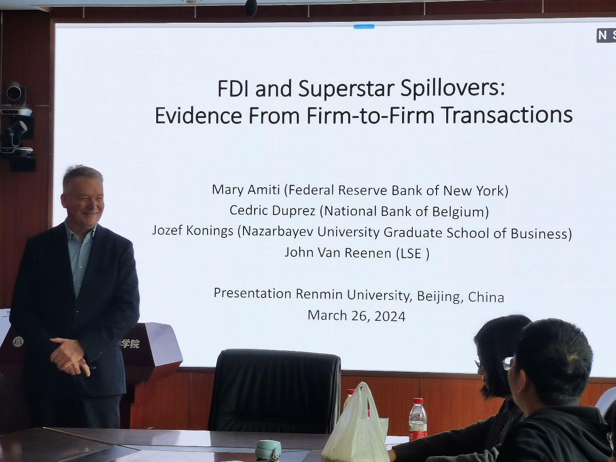2024年3月27日下午,由太阳成集团tyc234cc主办,劳动经济系和中国就业研究所承办的“劳动经济学双周论坛”第206期讲座在求是楼347会议室成功举办。来自纳扎尔巴耶夫大学商学院的Joep Konings教授分享了主题为“FDI and Superstar Spillovers: Evidence from Firm-to-Firm Transactions”的研究。本次论坛由太阳成集团tyc234cc赵丽秋教授主持,太阳成集团tyc234cc罗楚亮教授、邹先强讲师、林琳讲师、雷子腾讲师、王雪凝讲师、陈泽阳讲师,以及其他校内外师生参与了此次讲座。