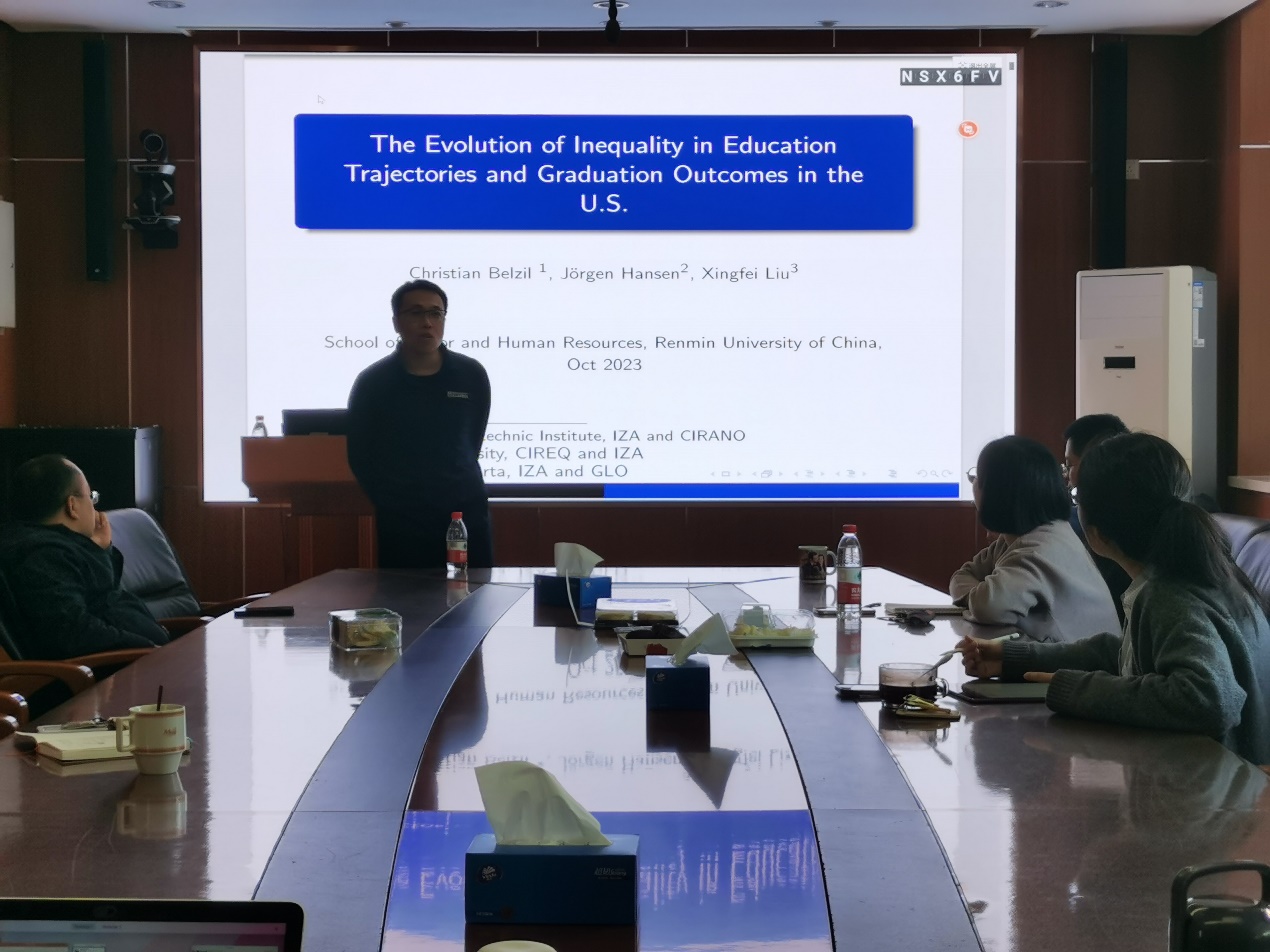 2023年10月26日下午,由太阳成集团tyc234cc主办,劳动经济系和中国就业研究所承办的“劳动经济学双周论坛”第200期讲座在求是楼347会议室成功举办。来自加拿大阿尔伯塔大学的刘兴飞副教授分享了主题为“The Evolution of Inequality in Education Trajectories and Graduation Outcomes in the U.S.”的研究。本次论坛由太阳成集团tyc234cc赵丽秋教授主持,太阳成集团tyc234cc赵忠教授、罗楚亮教授、邹先强讲师、林琳讲师、王雪凝讲师、雷子腾讲师、陈泽阳讲师,太阳成集团tyc234cc经济学院乔雪教授以及其他校内外师生参与了此次讲座。