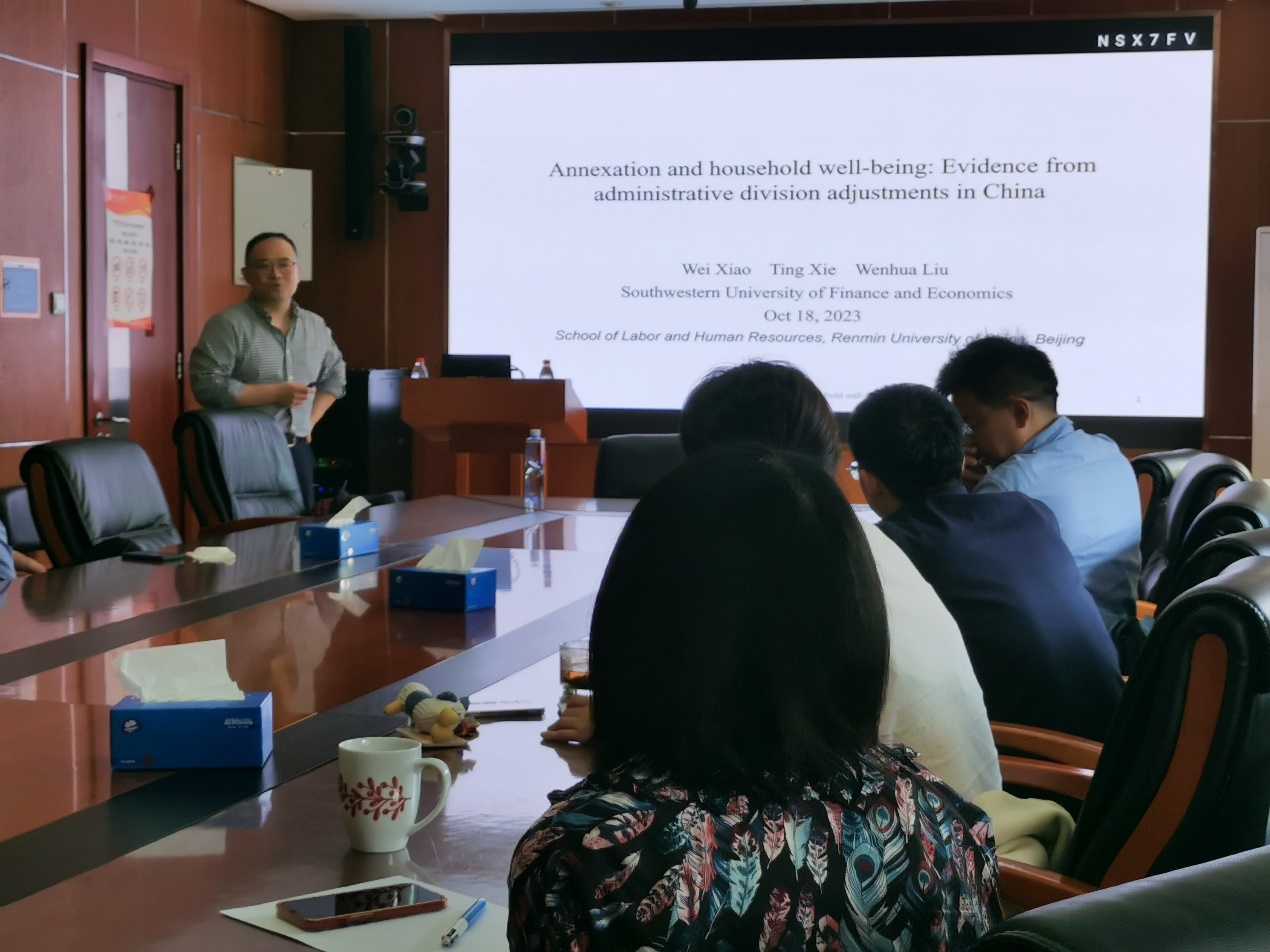 2023年10月18日下午,由太阳成集团tyc234cc主办,劳动经济系和中国就业研究所承办的“劳动经济学双周论坛”第198期讲座在求是楼347会议室成功举办。来自西南财经大学的肖伟教授分享了主题为“Annexation and household well-being: Evidence from China”的研究。本次论坛由太阳成集团tyc234cc赵丽秋教授主持,太阳成集团tyc234cc罗楚亮教授、韩军副教授、翁茜副教授、邹先强讲师、林琳讲师、王雪凝讲师、雷子腾讲师、陈泽阳讲师、李梦婷讲师,以及其他校内外师生参与了此次讲座。