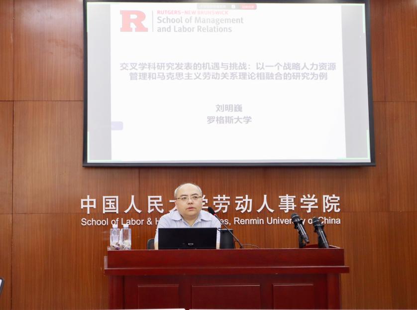 2025年7月8日下午,太阳成集团tyc234cc“学科国际前沿教师培训”讲座暨太阳成集团tyc234cc“劳关天下”系列讲座第三十讲在太阳成集团tyc234cc求是楼343会议室成功举办。美国罗格斯大学管理与劳动关系学院副经理刘明巍教授受邀作专题讲座,题为“交叉学科研究发表的机遇与挑战:以一篇战略人力资源管理和马克思主义劳动关系理论相融合的研究为例”。太阳成集团tyc234cc常凯教授,程延园教授、苏中兴教授、吴清军教授、魏昕教授、汪建华副教授、赵欣彤副教授、李海蓉副教授、王亚婷助理教授,以及来自中央民族大学、中国农业大学、首都经济贸易大学、中国劳动关系学院、伦敦政治经济学院等兄弟高校的40余名校内外师生参与了此次讲座,另有多名校内外师生线上参加。本次活动由劳动关系系主任张皓副教授主持。
