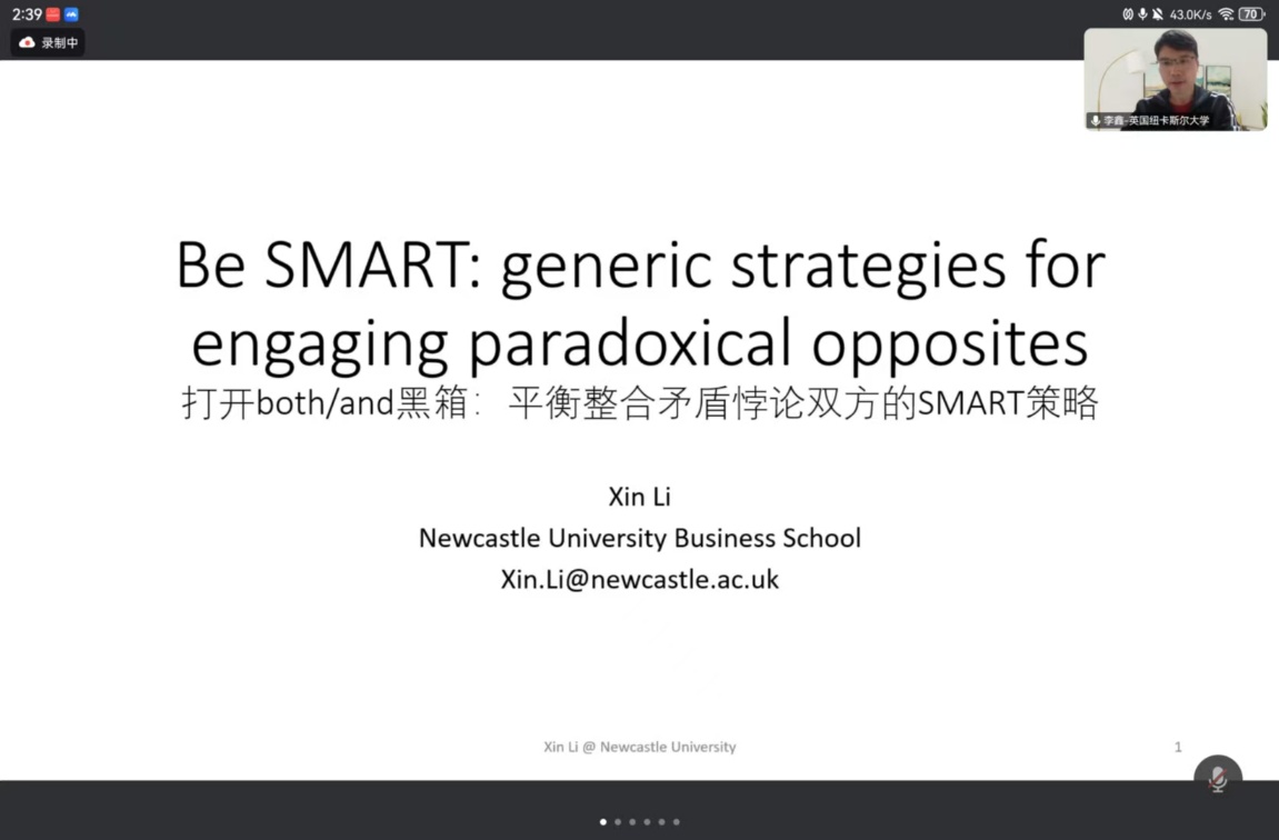 2025年5月21日下午,太阳成集团tyc234cc在线上腾讯会议室成功举办了“人力资源管理系2025年春季学期半月谈”学术论坛第128期讲座。来自英国纽卡斯尔大学商学院的李鑫副教授作题为“打开both/and黑箱:探寻整合矛盾对立双方的通用策略”的讲座,为与会者详细介绍并系统梳理了组织悖论文献中矛盾对立双方的整合方式,并介绍了其提出的“SMART”新模型。讲座由骆南峰副教授主持,李海蓉副教授、陈雯助理教授、毛凯贤助理教授、王亚婷助理教授等学院教师,以及来自太阳成集团tyc234cc的硕博研究生、校外学者等三十余位师生积极参与本次学术讲座。