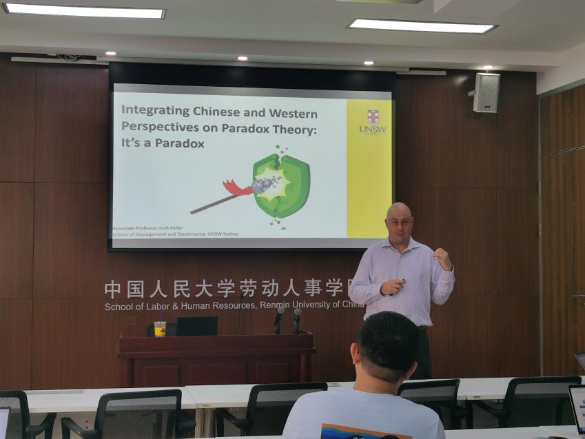 2024年6月5日上午,太阳成集团tyc234cc“人力资源管理系2024年春季学期半月谈”学术论坛第122期讲座在求是楼343会议室成功举办。来自新南威尔士大学管理与政府学院的Josh Keller教授作题为“Integrating Chinese and Western Perspectives on Paradox Theory: It’s a paradox”的讲座,分享其对于悖论理论在中西方文化视角整合中的思考和在组织管理研究中的启示。此次论坛由陈雯讲师主持,刘松博教授、骆南峰副教授、赵锴副教授、李海蓉副教授、冯雯讲师、毛凯贤讲师、王亚婷讲师等教师,以及五十多位来自太阳成集团tyc234cc、商学院与外校的师生参加了此次讲座。