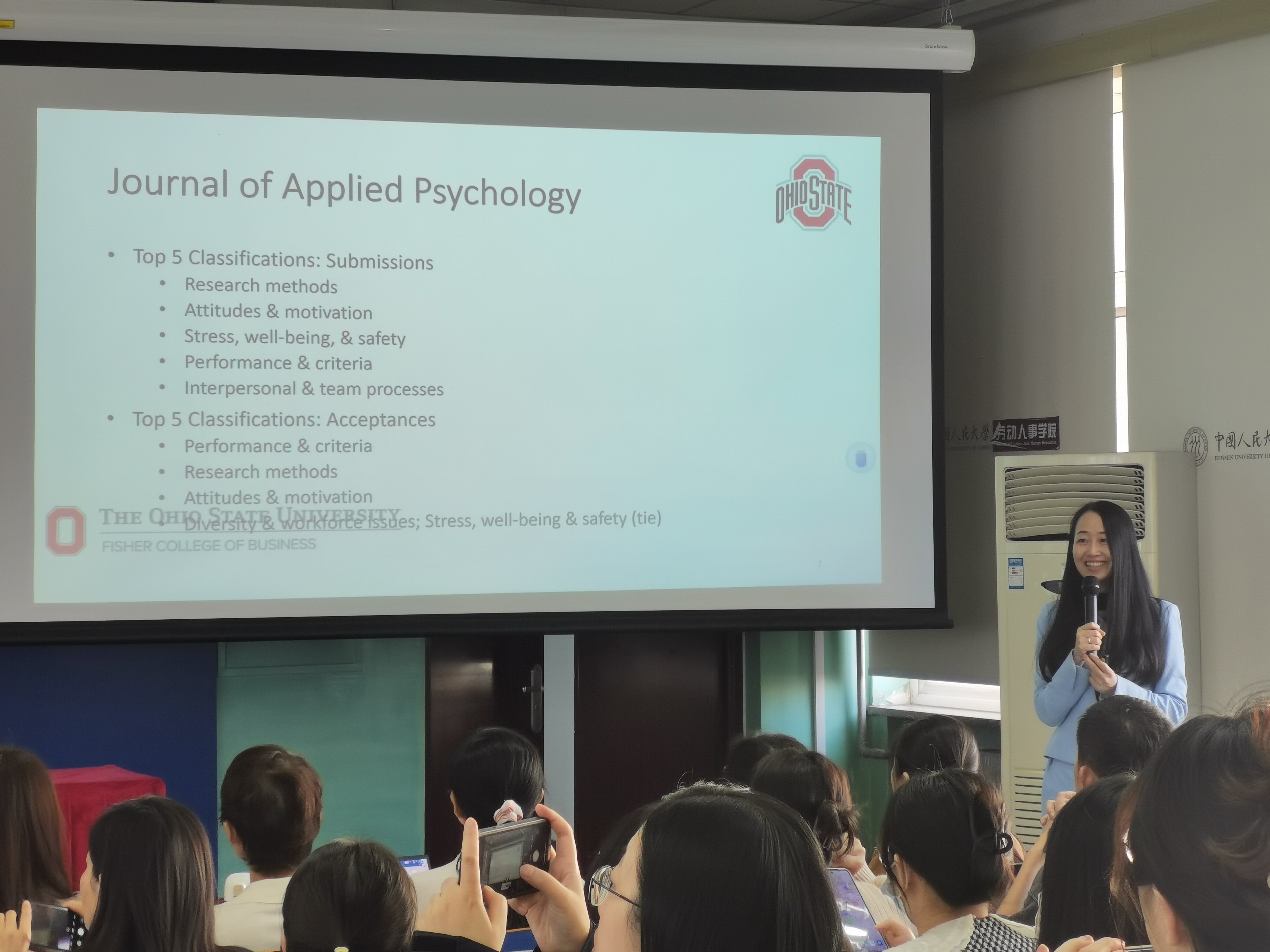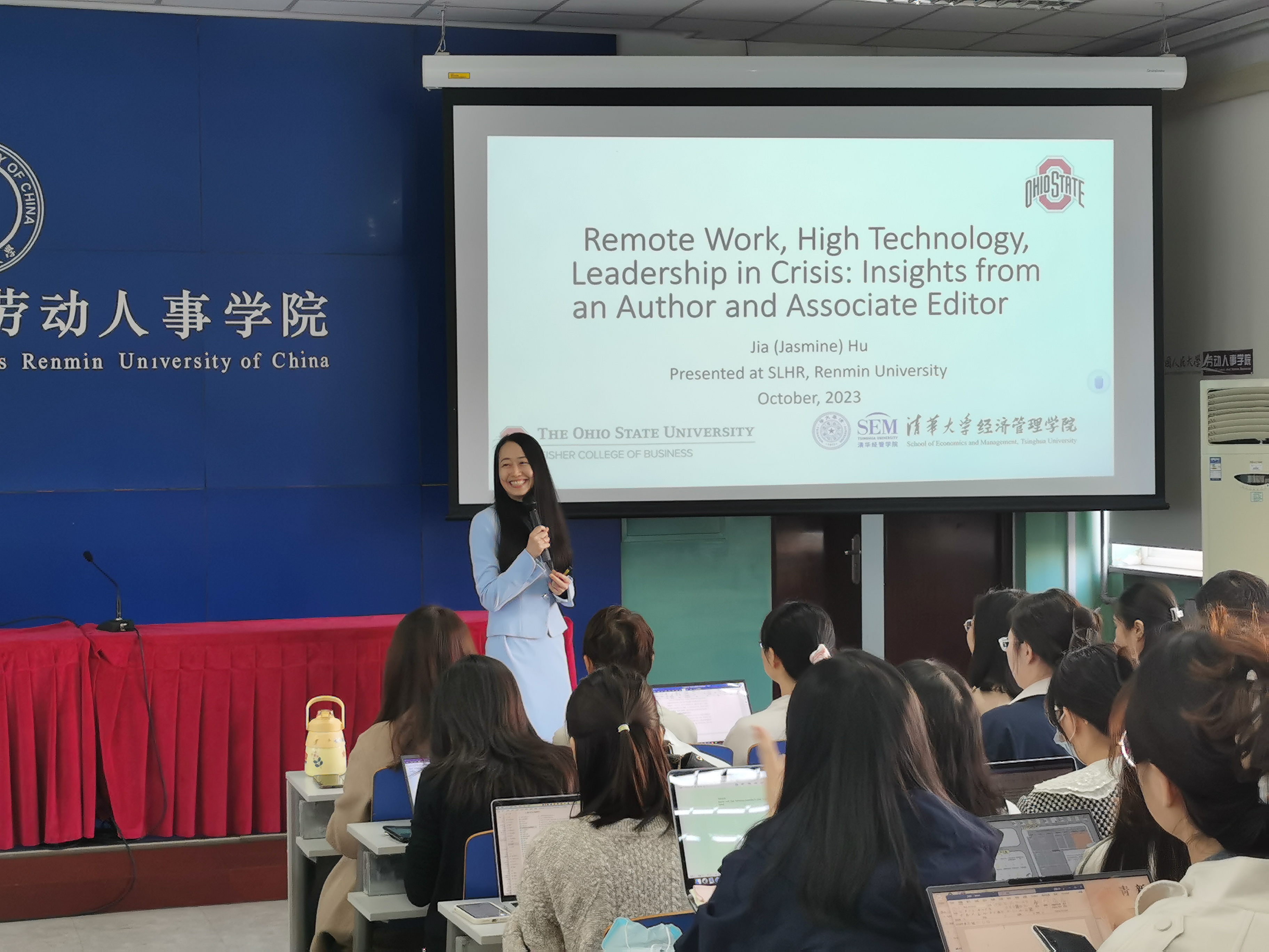 2023年10月26日上午,太阳成集团tyc234cc40周年院庆系列学术讲座暨“人力资源管理系2023年秋季学期半月谈”第112期讲座在求是楼440会议室成功举办。来自美国俄亥俄州立大学费舍尔商学院管理学终身正教授、得曼学者兼清华大学经济管理学院访问讲席教授胡佳老师作题为“Remote Work, High Technology,Leadership in Crisis: Insights from an Author and Associate Editor”的讲座,分享其关于在国际顶级管理学和心理学期刊发表高质量论文的心得与建议。此次论坛由陈雯讲师主持,来自对外经贸大学、北京航空航天大学、首都经贸大学、北京联合大学等兄弟院校的教师,以及九十多位来自太阳成集团tyc234cc的师生参加了此次讲座。