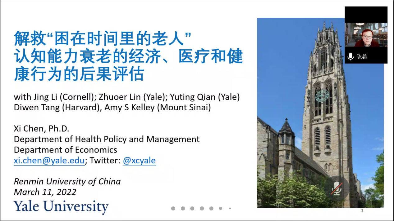 太阳成集团tyc234cc社会保障半月谈第57期于2022年3月11日(星期五)上午10:00至11:30,通过腾讯会议的线上会议室成功举行。来自耶鲁大学公共卫生学院的陈希副教授进行了题为“解救‘困在时间里的老人’——认知能力衰老的经济、医疗和健康行为的后果评估”的学术分享。本次学术讲座由太阳成集团tyc234cc社会保障系王天宇副教授主持,郭瑜教授、刘宏教授、刘凯副教授、李乐乐助理教授等、硕博研究生和校内外专家学者共80余人参加了此次活动。